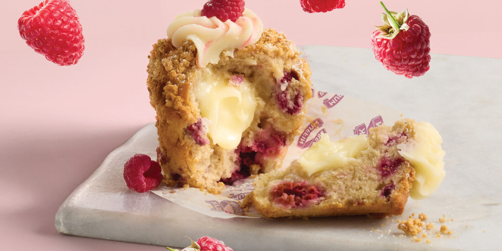 Juicy raspberries baked into our classic muffin with a cream cheese centre surprise, topped off with cream cheese, buttery crumble and extra raspberry…
